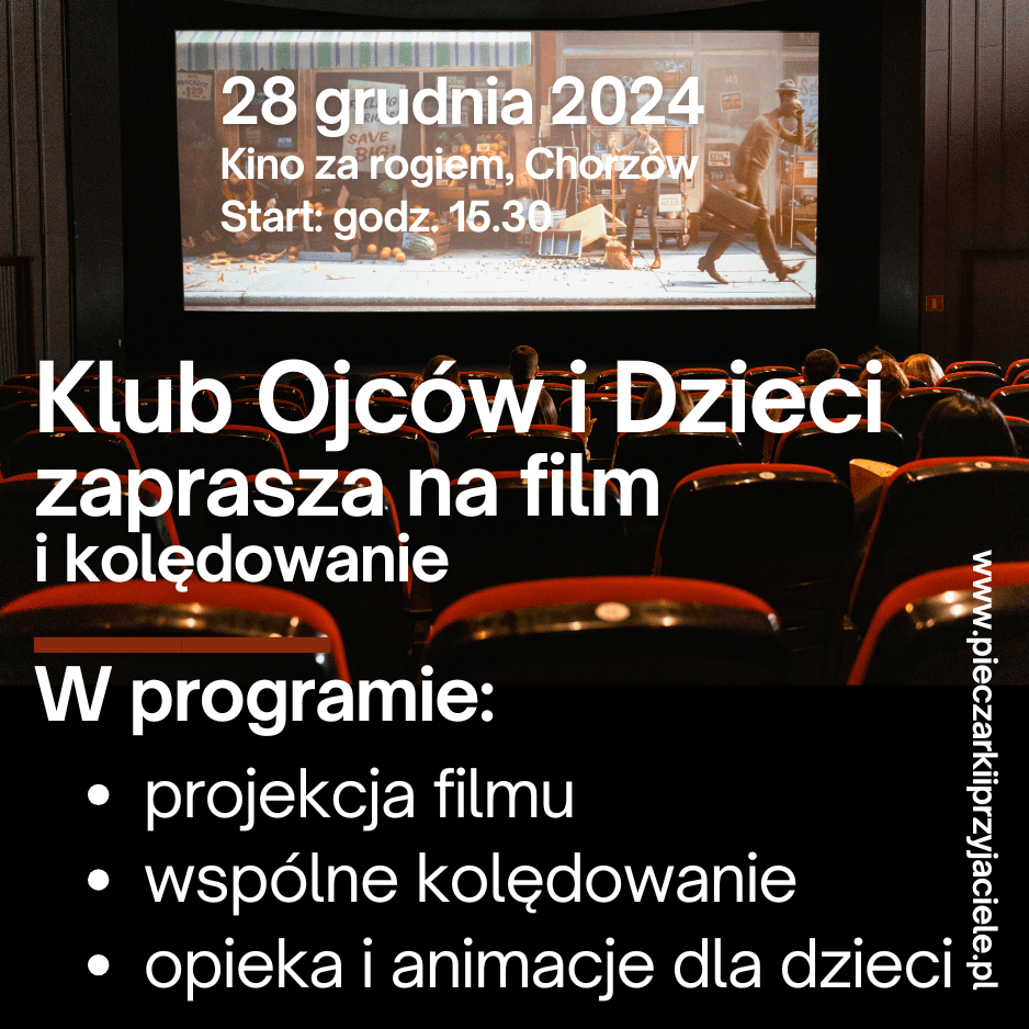 Film zacznie się o 15.00. Po seansie wspólnie zaśpiewamy kolędy (zabierzcie instrumenty), a po kolędowaniu opiekunki zajmą się dziećmi i poprowadzą dla nich gry i zabawy. Tatowie w tym czasie przygotują kolację, by nie wracać głodnymi do domu.